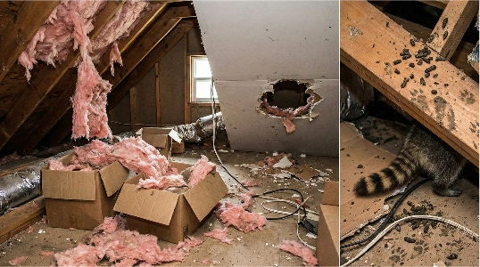 Noise at night and chewed insulation are often the first signs of raccoon infestation. Most probably, animals in attics and chimneys move in for warmth. However, we use Ontario-approved one-way doors for complete wild animal removal in Brampton.